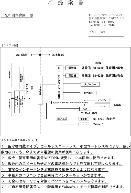 | ※2階は園長先生のご自宅です。何 かあったときのため、いつでも内線 でお話できるように電話機を1台取 付させていただきました。 ※2階専用で電話番号を追加させて |